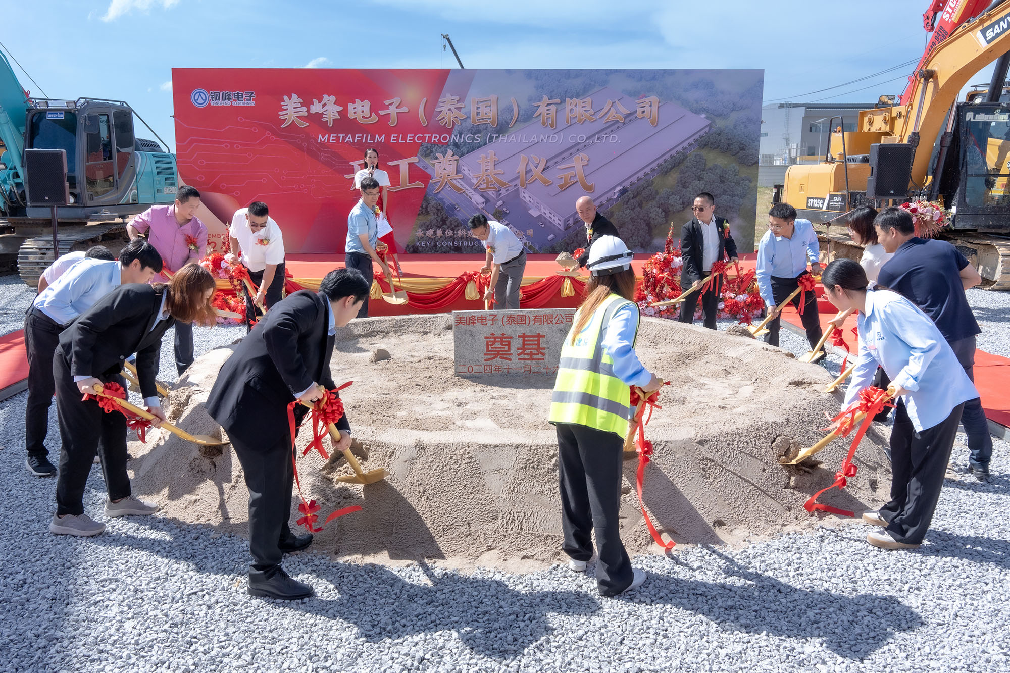 11月26日,美峰電子(泰國)有限公司開工奠基儀式在泰國羅勇府偉華工業(yè)園隆重舉行。公司黨委副書記潘世宇,泰中工商聯(lián)合總商會主席林偉,偉華工業(yè)園、泰國網(wǎng)傳媒有限公司、美峰電子、項目施工單位負責(zé)人等共同見證這一盛事。